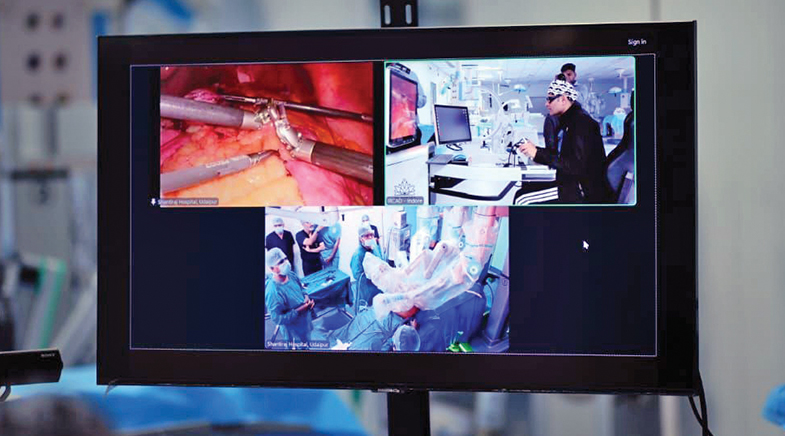 A split screen showing a close-up of an operation site; the surgeon is at a remote location, and the surgical team is at the OT.