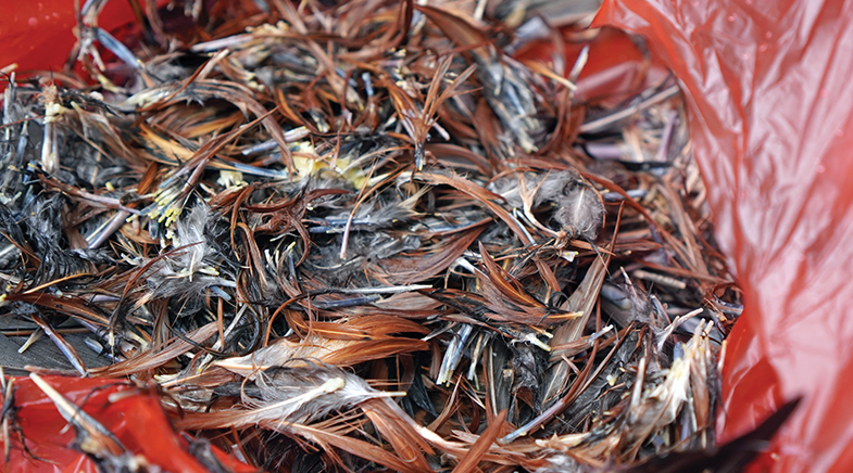 Protic ionic liquids can penetrate rigid keratin structures and loosen the network of chemical bonds that give feathers their strength.