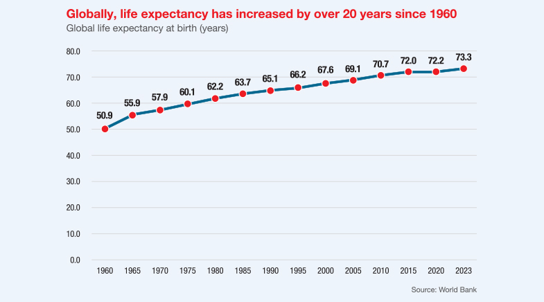 Global life expectancy has risen from 51 years in 1960 to over 73 years in 2023, adding roughly two to three years per decade through public health measures, vaccines, antibiotics, and better living standards. Yet, longevity remains uneven. The lifespan of people in Japan exceeds that of those in Nigeria by 30 years. People in high-income economies live, on average, 15 years longer than those in low-income countries. These gaps show that longevity is complex. Still, the broad rise across every region proves science can extend life. As research shifts to the biology of ageing, the next frontier is ensuring those extra years are healthy ones.