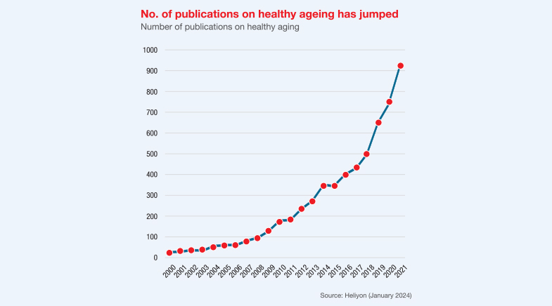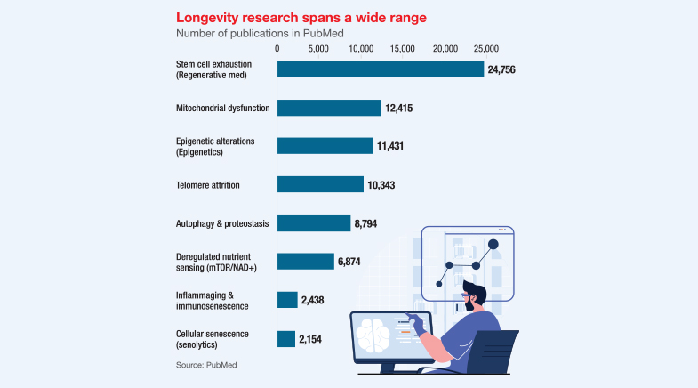 Researchers now describe the 'hallmarks of ageing' – cellular senescence, DNA damage, telomere shortening, mitochondrial decline, and disrupted energy regulation — as biological processes that can be modified or repaired. Research on ageing now spans a wide scientific landscape, exploring stem cell exhaustion, mitochondrial dysfunction, epigenetic change, cellular senescence, and nutrient-sensing pathways. The most active areas are regenerative medicine (over 24,000 publications), mitochondrial biology, and epigenetic regulation. The number of papers on "healthy ageing" rose from 25 in 2000 to over 900 in 2021, as advances in genetics and computing turned ageing into an active scientific investigation.