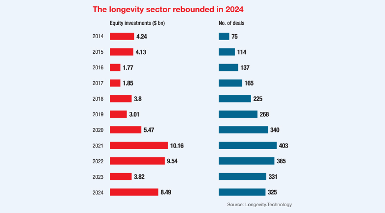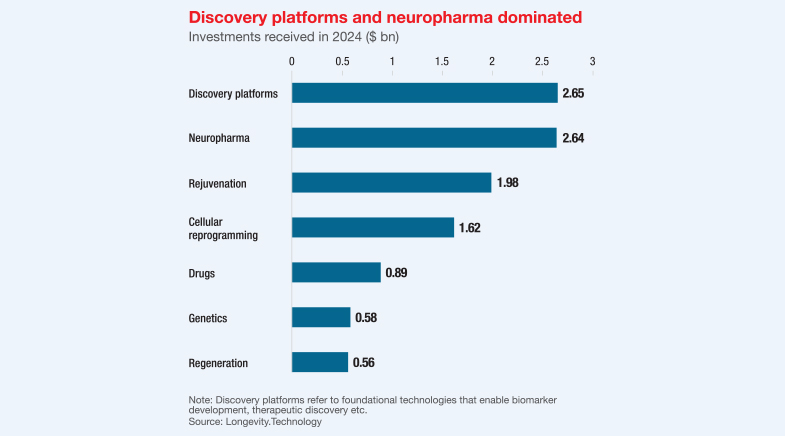 Money has followed science. Funding for longevity biotech peaked at $10 billion in 2021 before settling at $8.5 billion in 2024. The number of deals increased five-fold over the past decade. Within the portfolio for 2024, discovery platforms and neuropharma each drew $2.6 billion, while cellular reprogramming and rejuvenation accounted for $3.6 billion. These mirror key strategies: clearing senescent cells, reprogramming cells, and enhancing tissue repair. High-profile ventures like Altos Labs and Calico Life Sciences combine gene editing, machine learning, and regenerative biology. AI platforms like DeepMind's AlphaFold are accelerating drug discovery and enabling precise interventions.