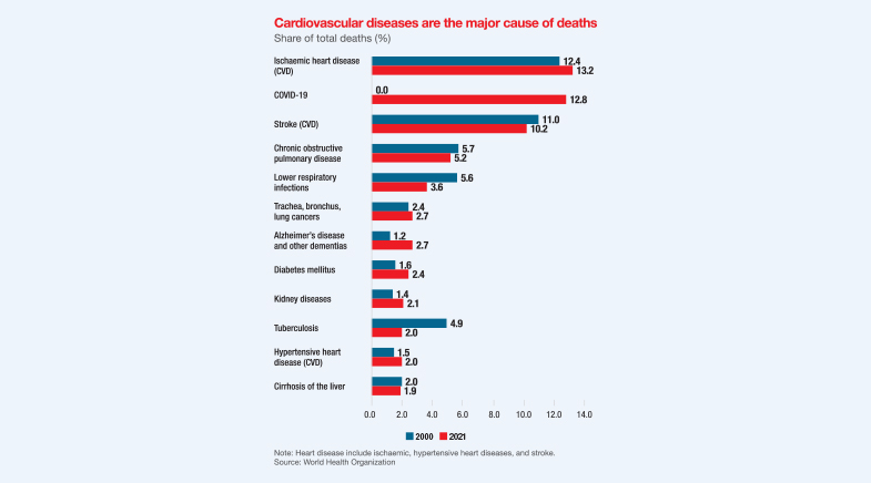 As life expectancies increase, the causes of death have shifted from infectious to chronic diseases. The share of deaths by tuberculosis, diarrhoea, and HIV/AIDS has dropped. Now, heart disease, stroke, and chronic lung conditions dominate. Diseases linked to ageing, such as Alzheimer's, diabetes, and kidney disorders are rising steadily. The emerging challenge is delaying the onset of death by managing the cellular damage underlying most chronic conditions.