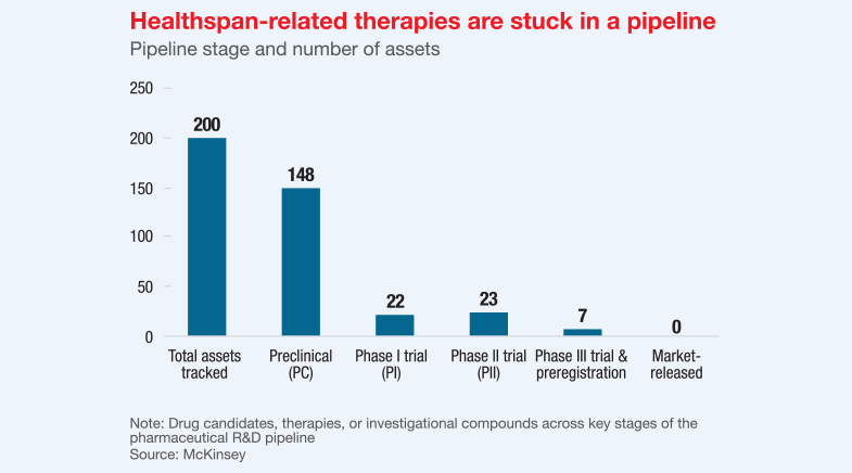 Yet, investment outpaces translation. Most longevity candidates in development remain in the laboratory or early clinical stages, and very few have reached the market with proven healthspan benefits. The current pipeline spans three routes, according to consulting firm McKinsey: repurposing existing drugs, combining known mechanisms, and developing entirely new ones. But progress is slowed by limited long-term human data and the absence of clear regulatory pathways.