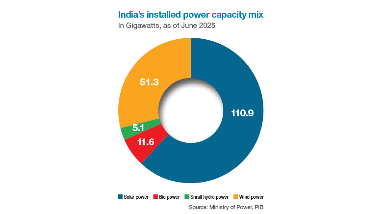 Till then, the country will continue to increase its renewable energy capacity. Currently, nuclear energy's contribution to India's total installed power capacity of 476 GW is only 1.8%, while solar energy accounts for 23.3%, wind energy for 10.8%, biopower for 2.4%, large hydro and small hydro for 11.2%, and coal for around 50.5% (bit.ly/Energy-Breakup). Falling costs and increasing efficiencies of solar modules and wind turbines, along with financial incentives and the National Solar Mission, helped the country nearly triple its installed renewable energy capacity, from 76.37 GW in 2014 to 226.79 GW by 2025 (bit.ly/Capacity-Increase). Non-fossil fuel sources now account for 49% of the country's total installed capacity. However, this pace of increase is expected to slow down over the next decade.