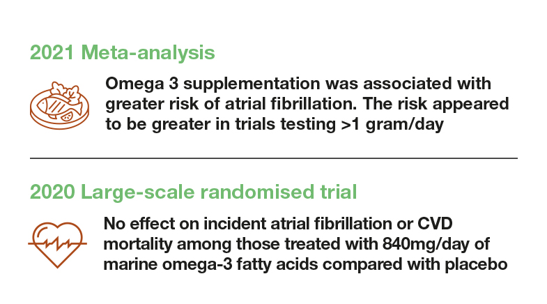 Fish oil supplements are widely considered to be good for everybody’s heart, but many studies have shown otherwise. In a 2021 meta-analysis of seven randomised controlled trials (bit.ly/meta-analysis-omega3), researchers found users of marine omega-3 fatty acid supplements had a 25% higher risk of atrial fibrillation events.