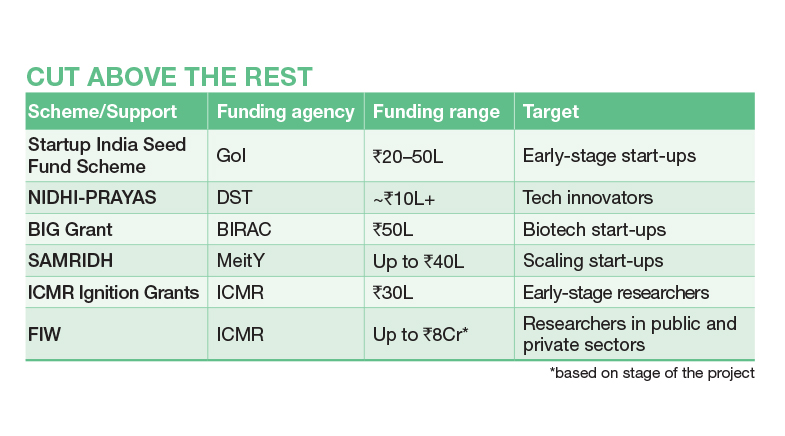 The FIW Grant amounts are significantly higher than typical grants, in crores of rupees rather than lakhs (see table: 'Cut above the rest'). The aim is to de-risk early innovation and accelerate translation while pushing the frontiers of medical science. Researchers are funded to develop demonstrable prototypes and to create a readiness for regulatory pathways or commercialisation. This could be a lifeline for start-ups that are too early in the product lifecycle to attract private funding (also see 'Indian start-ups dive into deep tech phase'). "These kinds of grants are very, very helpful, to take the prototype to the product level," says Shailesh Govind Ganpule, Associate Professor at IIT Roorkee.