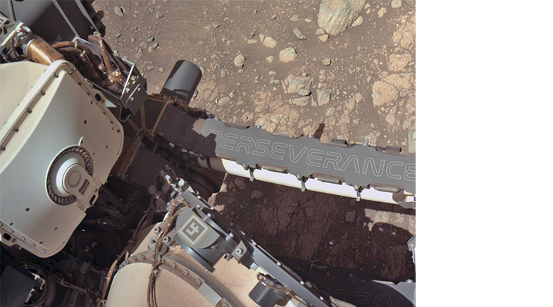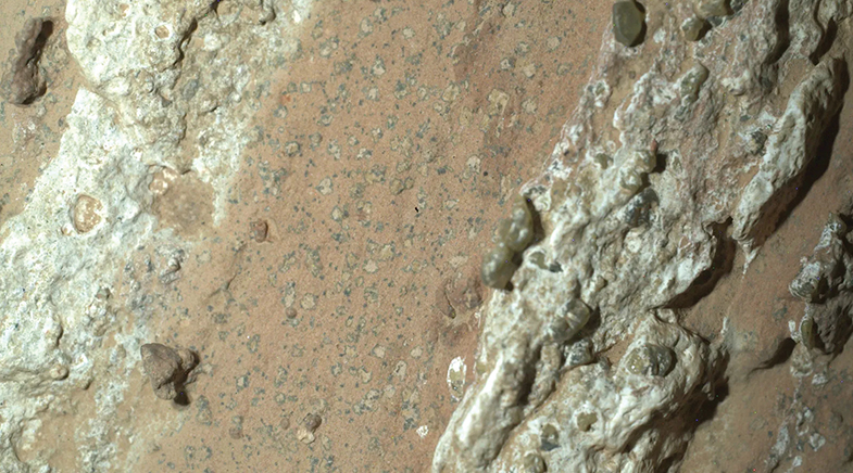 Now, nearly a year later, a study published in Nature in September 2025 (bit.ly/jezero-mars) states that the leopard spots may be potential biosignatures, an imprint of ancient life left on Martian rocks. The landing site for Perseverance was chosen after a five-year-long search, in which over 60 candidate locations were examined in detail. The researchers chose Jezero because of the possibility of locating traces of ancient microbial life there. On the mission's 1212th Martian day, the rover took pictures of rocks in the Bright Angel region with a camera called WATSON (Wide Angle Topographic Sensor for Operations and eNgineering), part of the SHERLOC (Scanning Habitable Environments with Raman and Luminescence for Organics and Chemicals) instrument suite aboard the rover (bit.ly/Leopard-Spots).